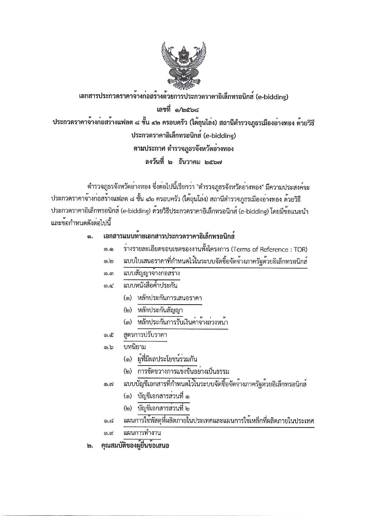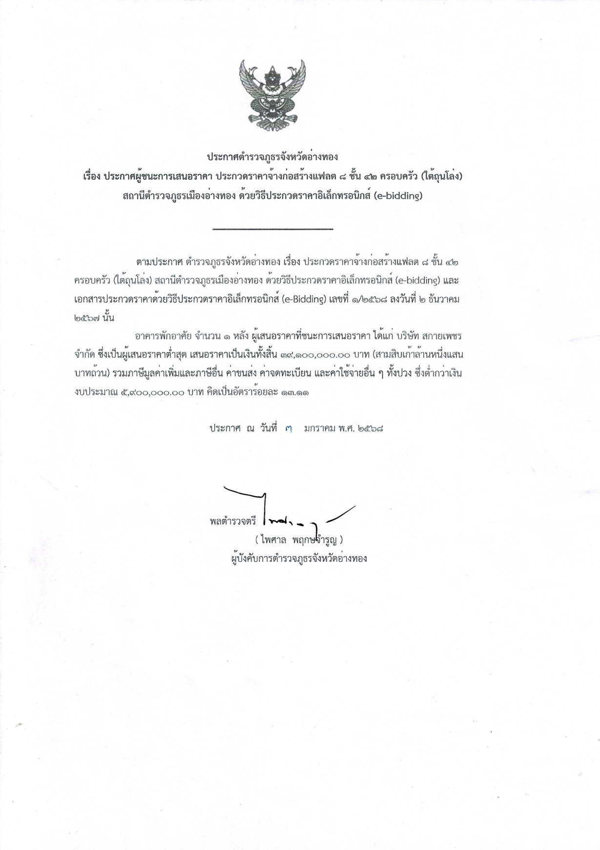 ตำรวจภูธรจังหวัดอ่างทองมีความประสงค์จะ ประกวดราคาจ้างก่อสร้างแฟลต 4 ชั้น 42 ครอบครัว (ใต้ถุนโล่ง) สถ
