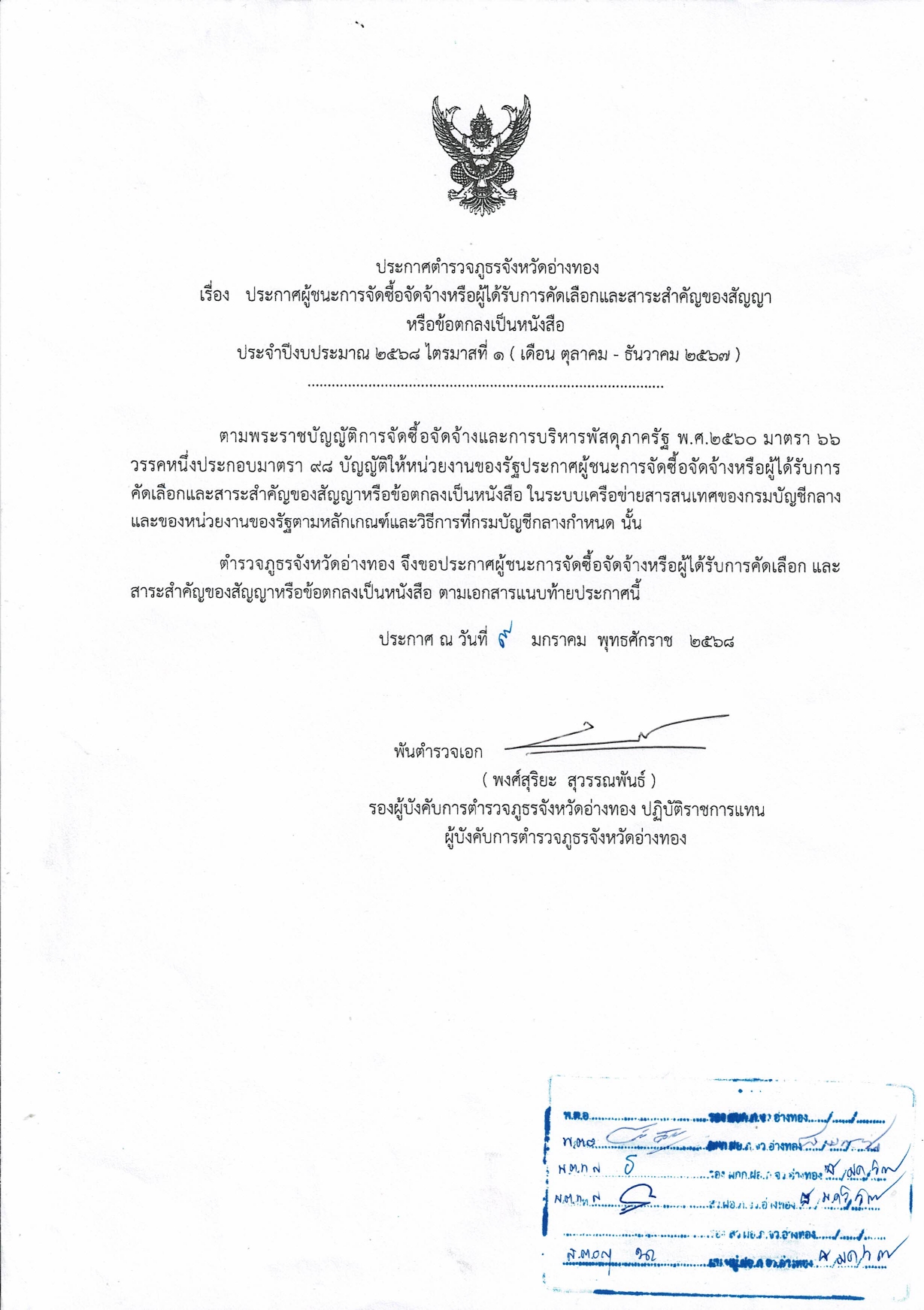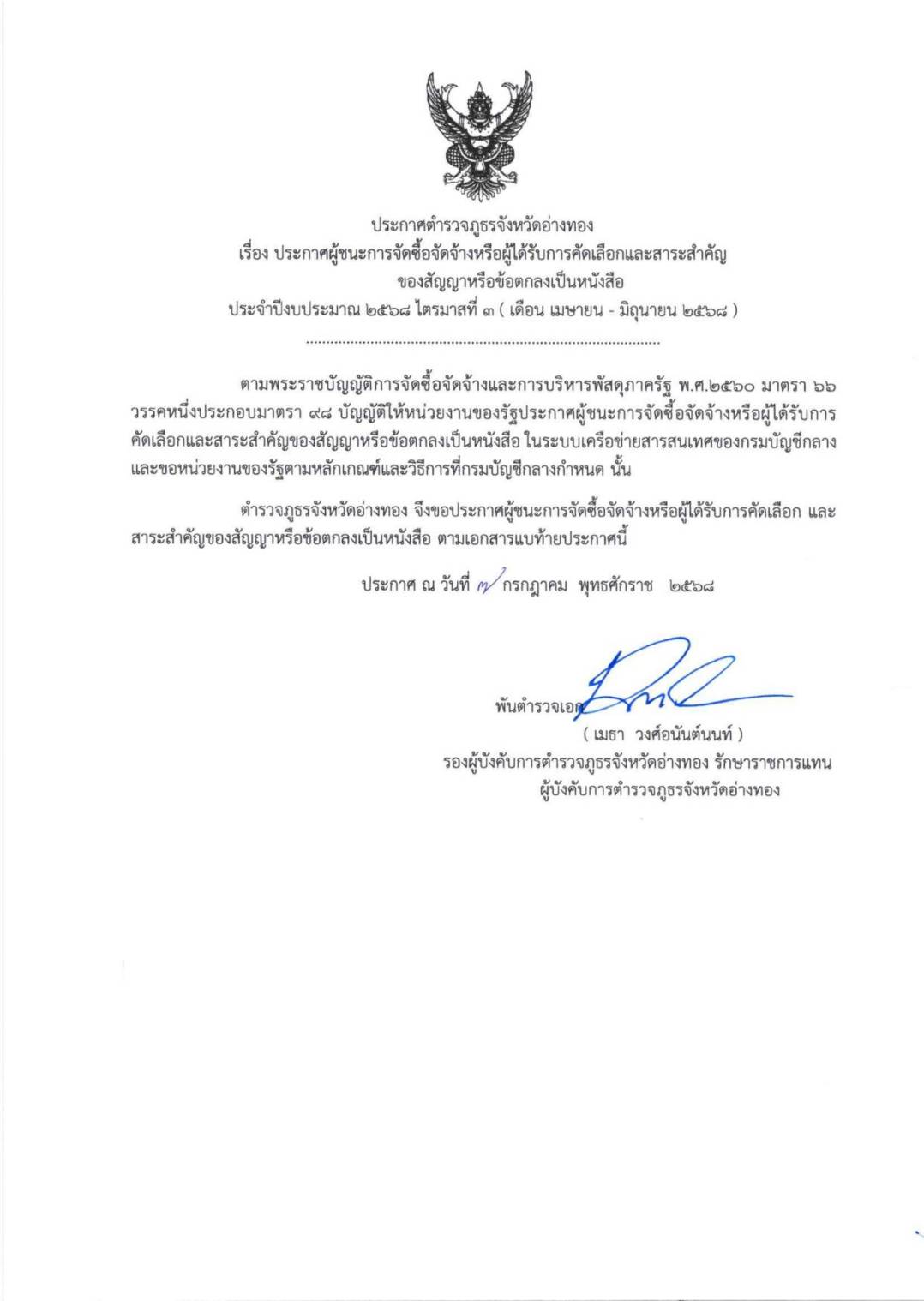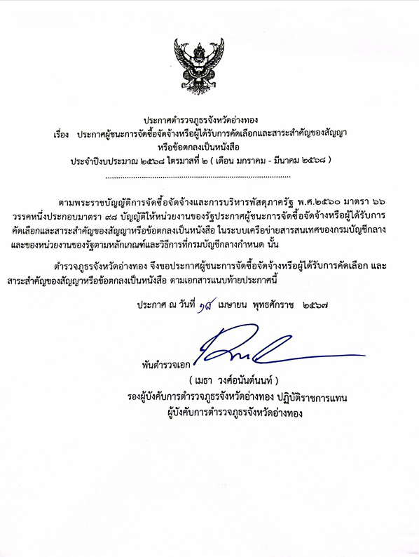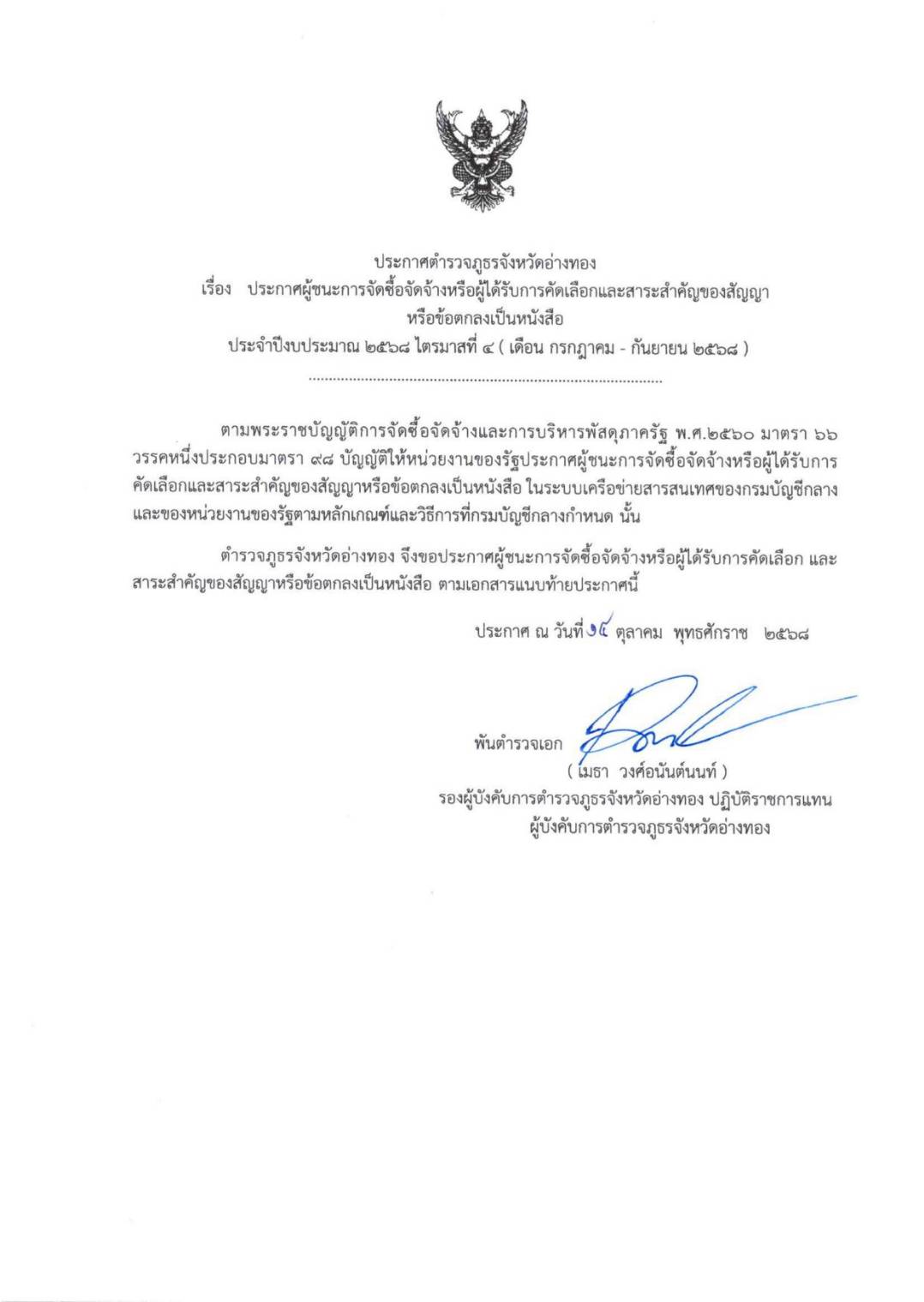 ประกาศผู้ชนะการจัดซื้อจัดจ้างหรือผุ้ได้รับการคัดเลือกและสาระสำคัญของสัญญาหรือข้อตกลงเป็นหนังสือ ประจ