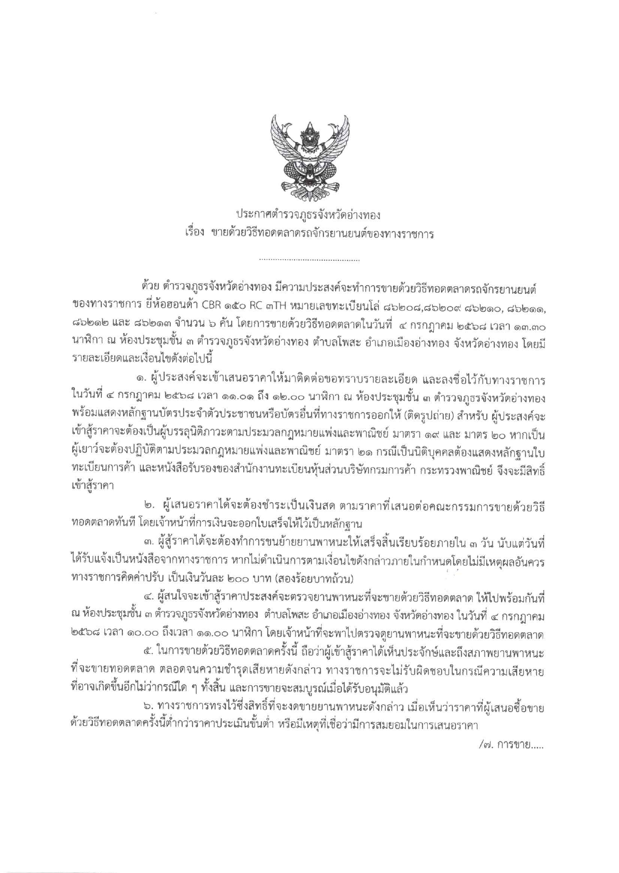 ตำรวจภูธรจังหวัดอ่างทอง มีความประสงค์จะทำการขายด้วยวิธีทอดตลาดรถจักรยานยนต์ ของทางราชการ ยี่ห้อฮอนด้