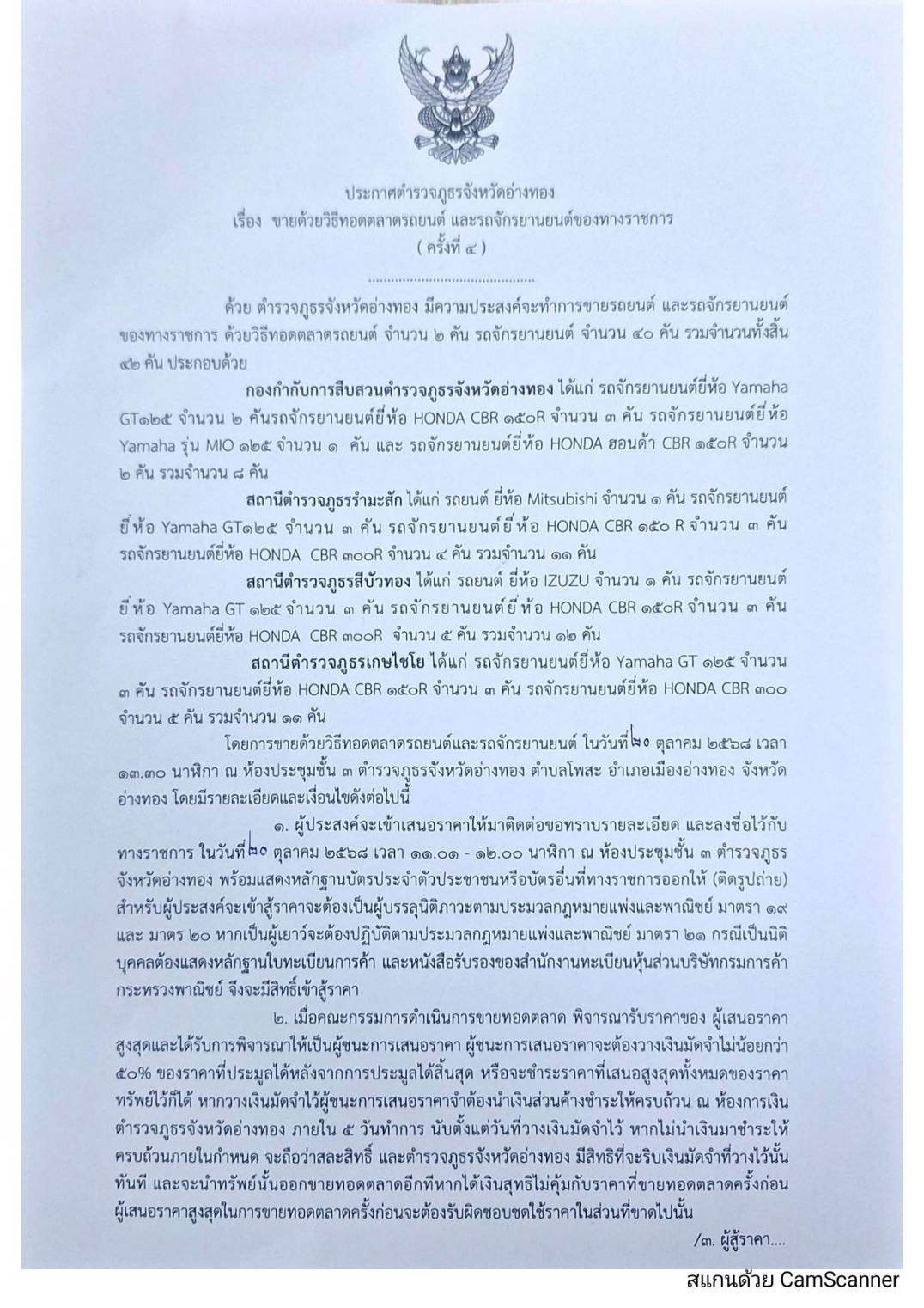 ขายด้วยวิธีทอดตลาด รถยนต์และจักรยานยนต์ ของทางราชการ ตำรวจภูธรจังหวัดอ่างทอง
