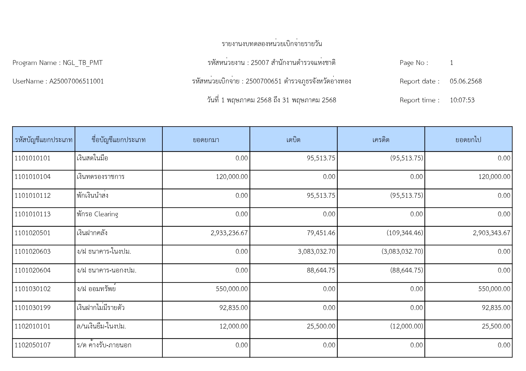 รายงานงบทดลองหน่วยเบิกจ่ายรายวัน ตำรวจภูธรจังหวัดอ่างทอง