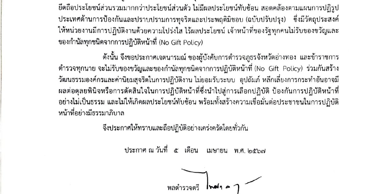 เจตนารมณ์ที่จะไม่รับของขวัญและของกำนัลทุกชนิดจากการปฏิบัติหน้าที่