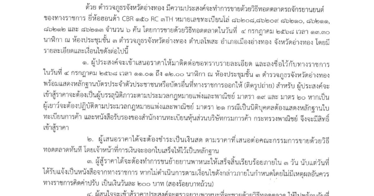 ตำรวจภูธรจังหวัดอ่างทอง มีความประสงค์จะทำการขายด้วยวิธีทอดตลาดรถจักรยานยนต์ ของทางราชการ ยี่ห้อฮอนด้า CBR ๑๕๐ RC ๓TH หมายเลขทะเบียนโล่ ๘๖๒๐๘,๘๖๒๐๙ ๘๖๒๑๐, ๘๖๒๑๑. ๘๖๒๑๒ และ ๘๖๒๑๓ จำนวน 6 คัน โดยการขายด้วยวิธีทอดตลาดในวันที่ ๔ กรกฎาคม ๒๕๖๘ เวลา ๑๓.๓๐ นาฬิกา ณ ห้องประชุมชั้น ๓ ตำรวจภูธรจังหวัดอ่างทอง ตำบลโพสะ อำเภอเมืองอ่างทอง จังหวัดอ่างทอง