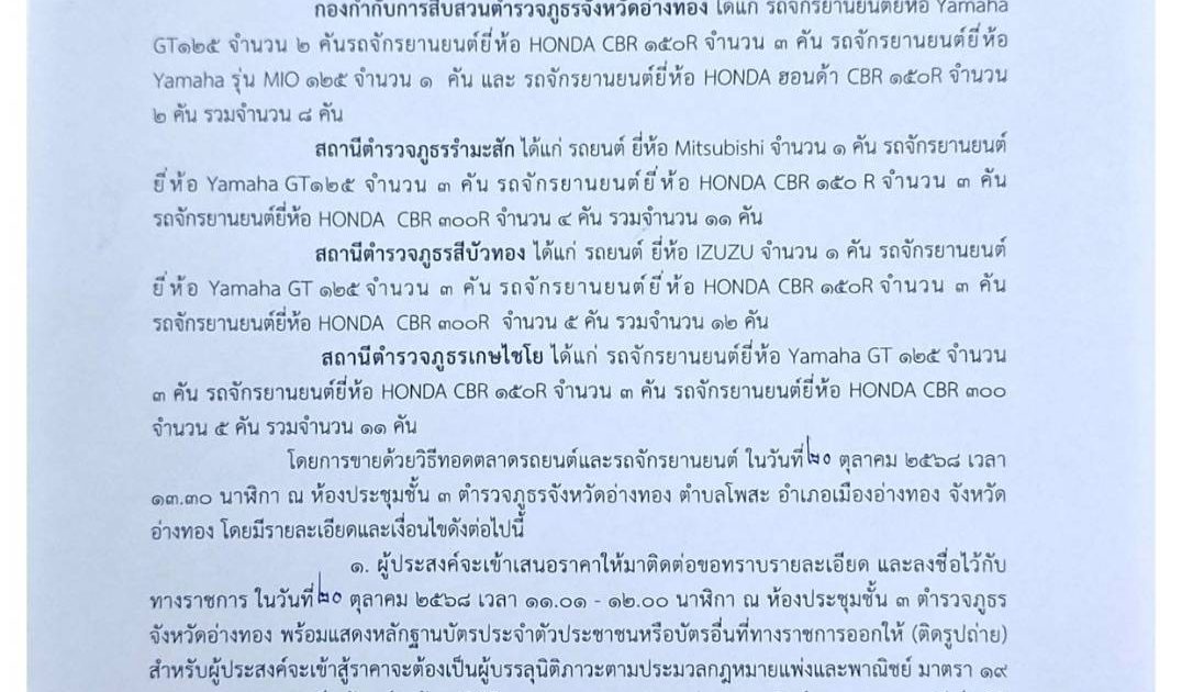 ขายด้วยวิธีทอดตลาด รถยนต์และจักรยานยนต์ ของทางราชการ ตำรวจภูธรจังหวัดอ่างทองประกาศขายทอดลาดครั้งที่ 4